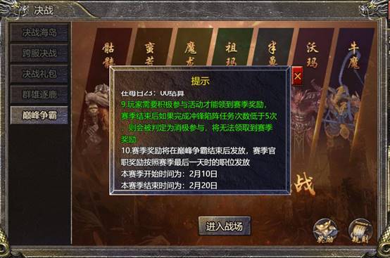 d. 期间尽情提高巅峰争霸中的战力吧,活动结束会根据官职和阵营排行发放丰厚的奖励