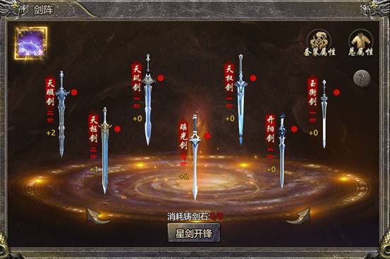 2、收集铸剑石为星剑开锋提升剑阵属性,七柄星剑开锋达到一定等级还能激活套装属性