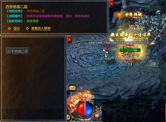 4、四圣绝境二层为跨服地图,死亡掉落为常规地图的1/3