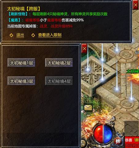 2、太初秘境目前开放4层,需要破魔等级达到一定要求后才能进入