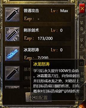 战士神技,冰龙怒涛,学习后永久提升100W生命值。冰霜覆盖刀刃,向身前刺出并且形成冰龙之势,对路径上的多个目标造成巨额的伤害,且有概率对目标造成剑气持续伤害。